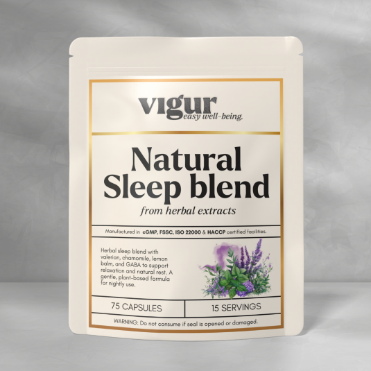 Natural Sleep Blend er et melatoninfritt søvntilskudd som kombinerer valerianrot, GABA, kamille, sitronmelisse og L-theanin – plantebaserte og funksjonelle ingredienser som er kjent for å fremme naturlig avslapning og søvnkvalitet.